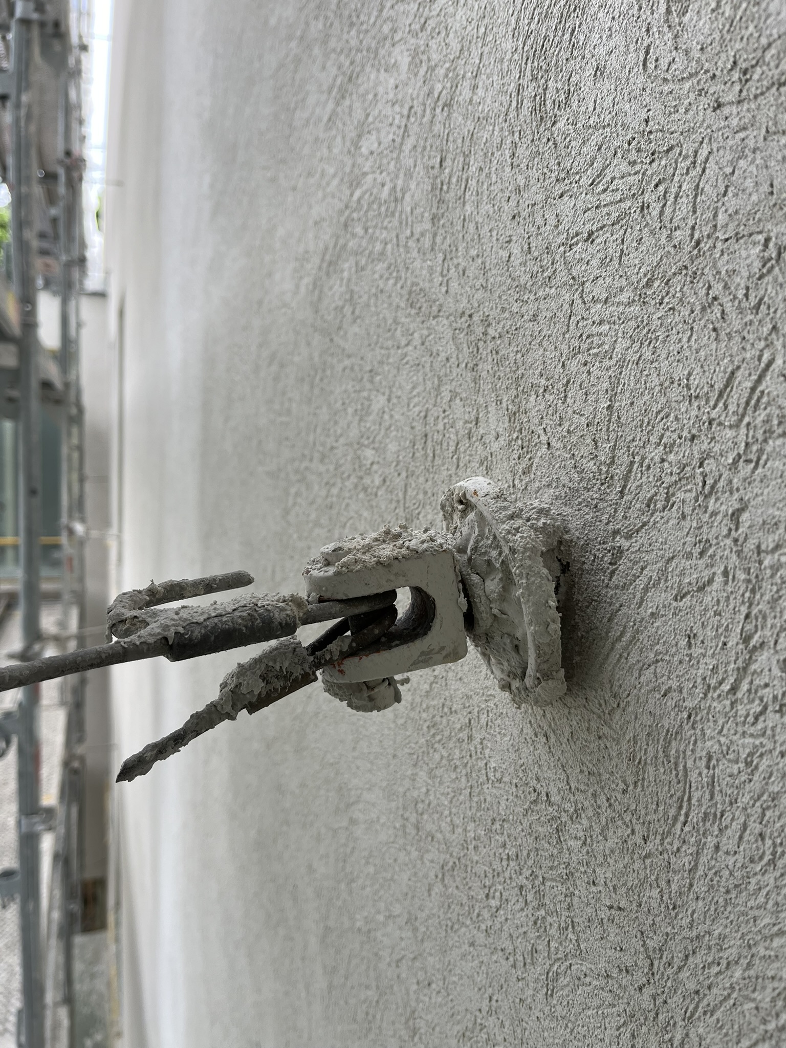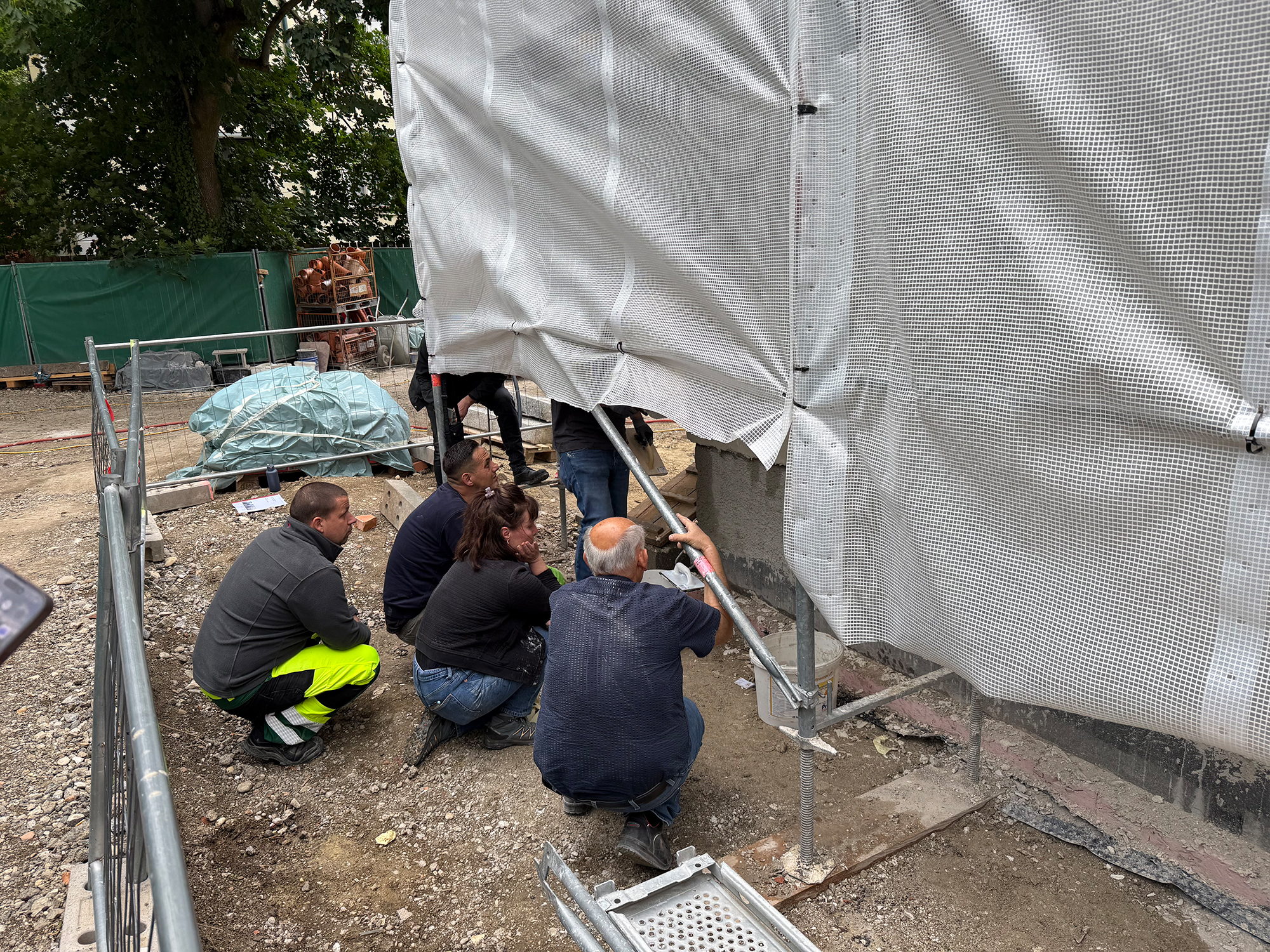 Am Ende wurde noch die richtige Bewegung beim Verreiben des Materials mit den Mitarbeitern gefunden: Damit keine sichtbaren „Arbeitsgrenzen“ entstehen, haben am Ende 12-15 Menschen gleichzeitig auf allen Gerüstebenen gearbeitet und jede Hausseite in einem Tag mit dem neuen Überriebputz überzogen.